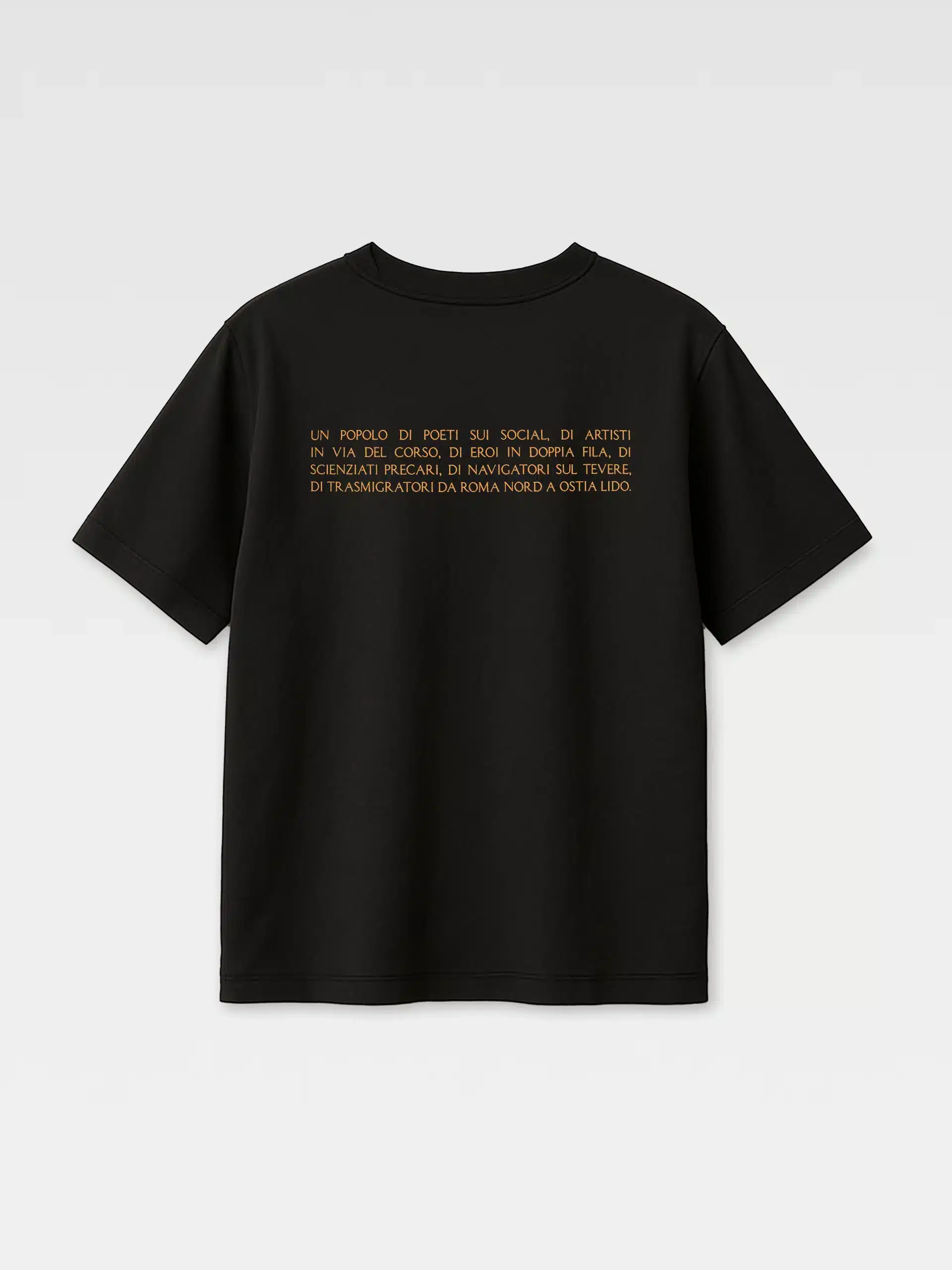 La T-Shirt Scritta nera racconta l’identità urbana con una frase iconica stampata sul retro. Oversize, in cotone biologico e arricchita dal tag URBS personalizzato: essenziale, contemporanea, profondamente romana.